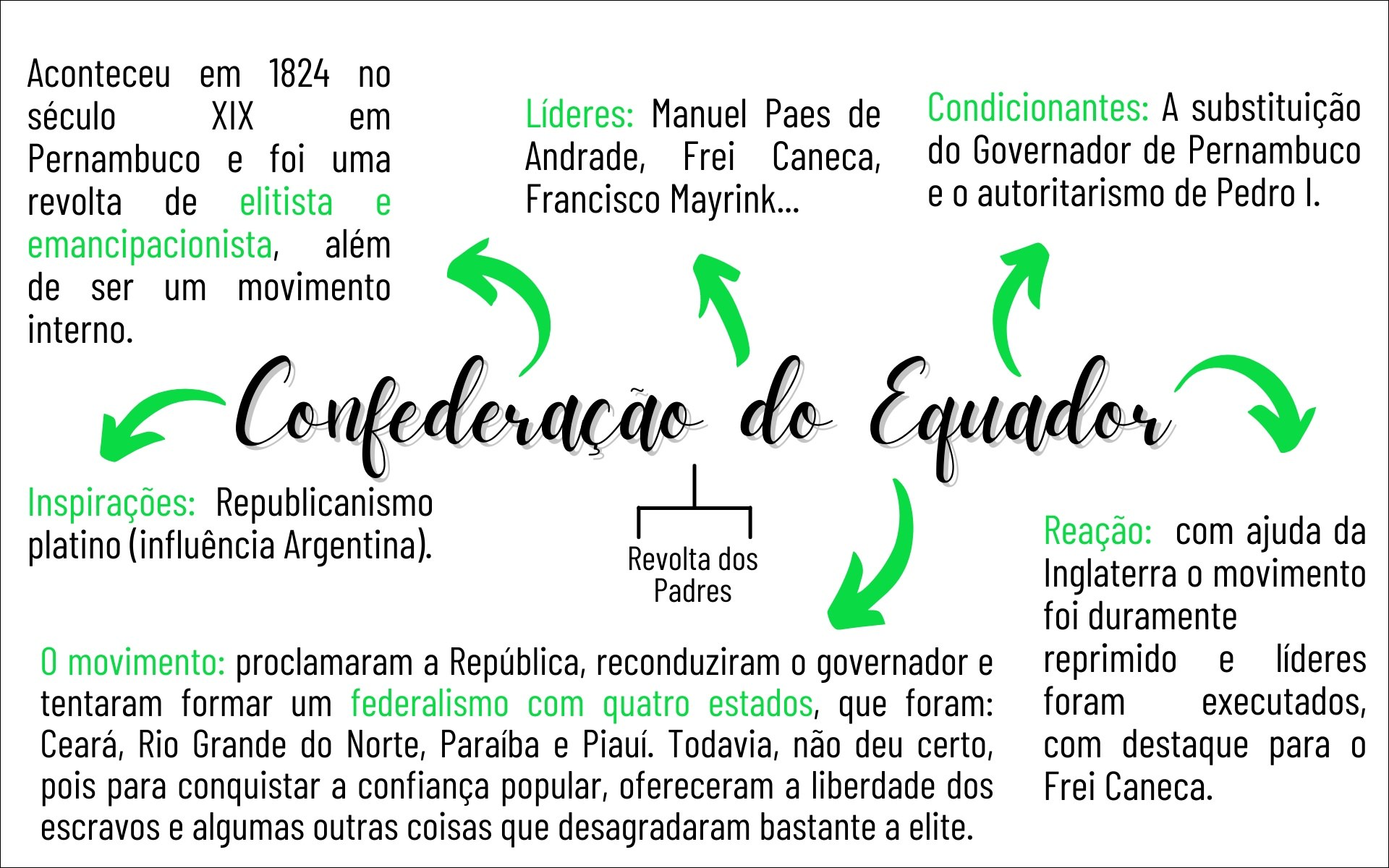 A Confederação do Equador foi um movimento revolucionário que se iniciou em Pernambuco e logo alcançou outras províncias vizinhas. Os revoltosos se levantaram contra o governo central por causa do autoritarismo de Dom Pedro I ao fechar a Assembleia Constituinte de 1823 e impor uma Constituição, no ano seguinte, que lhe assegurou poderes absolutistas. Além dessa oposição ao arbítrio do imperador, a confederação pretendia implantar o regime republicano. As tropas imperiais conseguiram abafar o movimento e matar seus líderes.