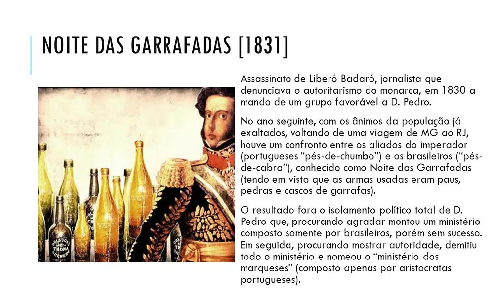 Em meio a estas tensões, D. Pedro I resolve fazer uma visita aos liberais de Minas Gerais, em 1831. Não é bem recebido nesta província, e então, quando regressa para o Rio de Janeiro, os portugueses que residiam nesta cidade e eram seus partidários, fizeram uma festa com luminárias para receber o imperador. Os brasileiros, descontentes, começaram a quebrar as janelas dos portuguesas. Estes últimos revidaram atirando garrafas contra os brasileiros, constituindo assim o episódio conhecido como Noite das Garrafadas.