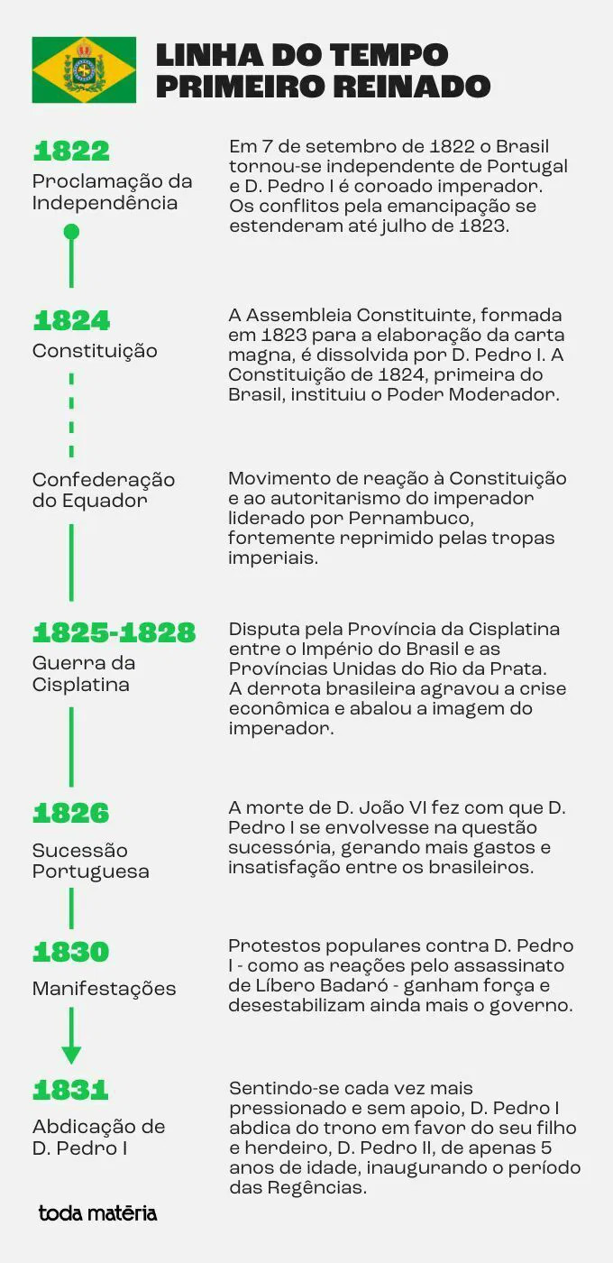 Após a saída de Dom João VI da colônia brasileira em 1821, seu filho, Dom Pedro I, fica encarregado como regente da colônia. Um ano depois, em 1822, o mesmo proclama a independência, a partir desse momento é iniciado o período do primeiro reinado.